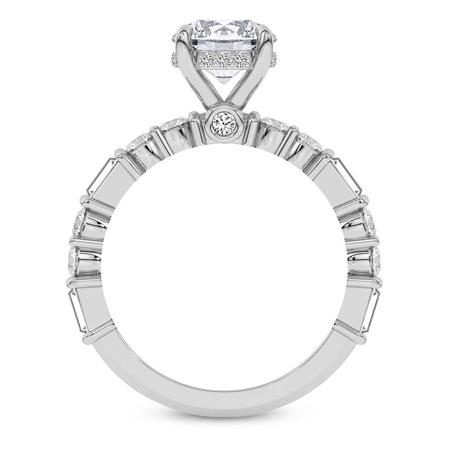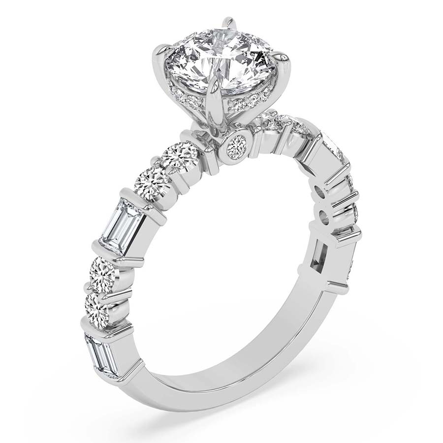 Timeless yet modern, the Enchanted Bliss Side Stone Lab Diamond Ring in 21kt white gold is a captivating blend of elegance and charm. The four-claw prong setting holds the brilliant center stone, enhanced by a hidden halo for subtle radiance. A bezel-set diamond, visible from the front, adds a unique touch. The dome straight shank features a mix of baguette and round diamonds, baguettes in sleek bar settings and rounds in both channel and prong setting, offering a dynamic play of light. With a 50% diamond spread, this ring is a refined choice for the modern romantic. Pair it with a contoured wedding band for a perfectly seamless bridal look.
