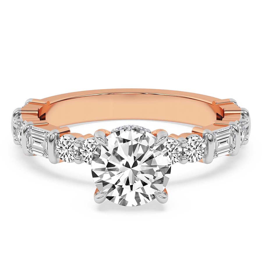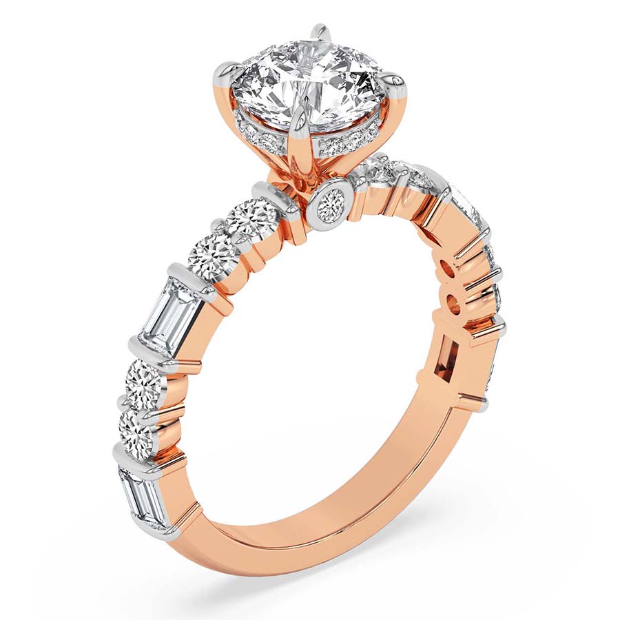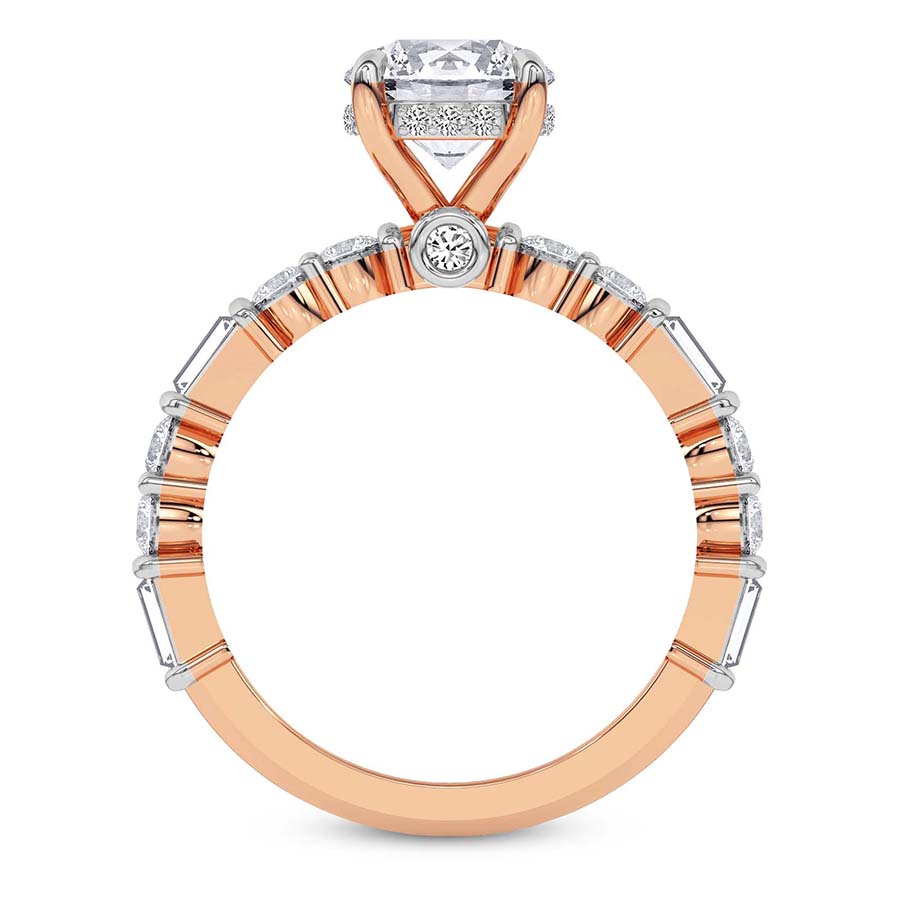 Timeless yet modern, the Enchanted Bliss Side Stone Lab Diamond Ring in 21kt rose gold is a captivating blend of elegance and charm. The four-claw prong setting holds the brilliant center stone, enhanced by a hidden halo for subtle radiance. A bezel-set diamond, visible from the front, adds a unique touch. The dome straight shank features a mix of baguette and round diamonds, baguettes in sleek bar settings and rounds in both channel and prong setting, offering a dynamic play of light. With a 50% diamond spread, this ring is a refined choice for the modern romantic. Pair it with a contoured wedding band for a perfectly seamless bridal look.