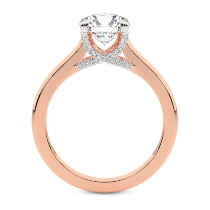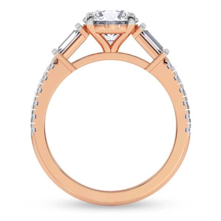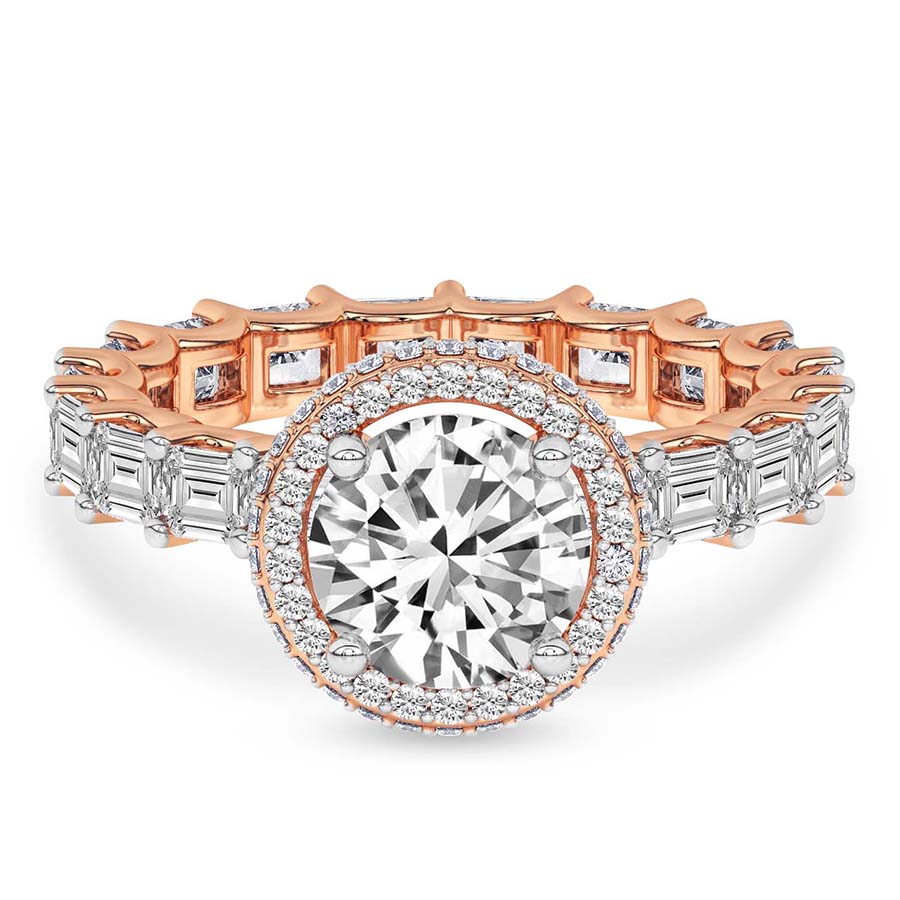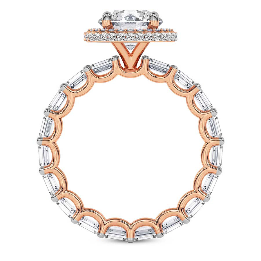 The Amaryllis Side Emerald Lab Diamond Ring crafted in 21kt rose gold is a captivating blend of classic beauty and radiant elegance. A stunning center diamond is set in a timeless 4-round prong setting, encircled by a brilliant halo of accent diamonds in a plate prong setting. This halo is designed to be visible from both the top and side view, offering a mesmerizing sparkle from every angle. The shank is adorned with a full eternity spread of diamonds, set in exquisite “U” prongs, ensuring a seamless, continuous shine around the finger. This engagement ring embodies the ultimate symbol of love, making it a timeless choice for a lifetime commitment. You can pair this ring with a complementary matching band, enhancing the stunning, full-circle sparkle for an unforgettable set.
