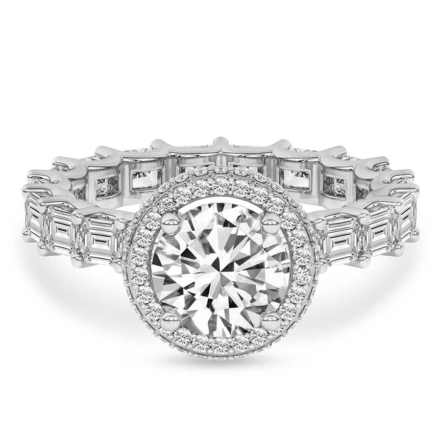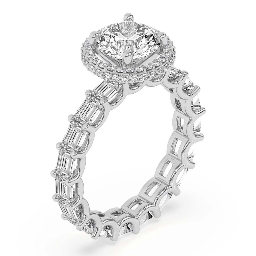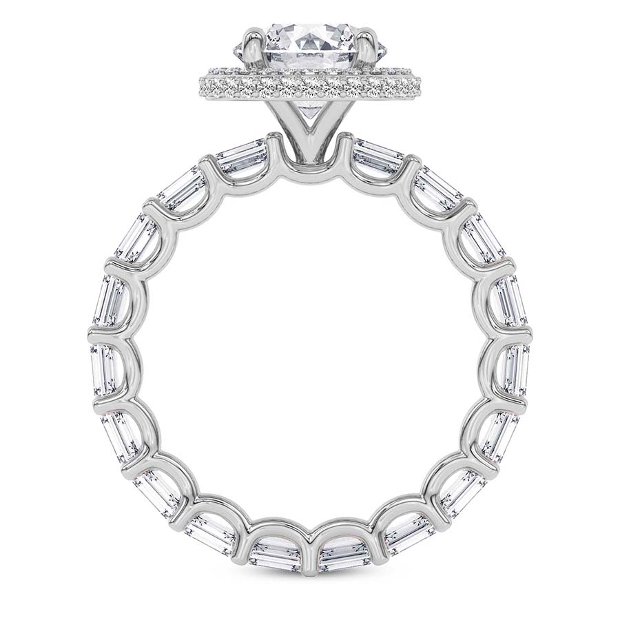The Amaryllis Side Emerald Lab Diamond Ring crafted in 21kt white gold is a captivating blend of classic beauty and radiant elegance. A stunning center diamond is set in a timeless 4-round prong setting, encircled by a brilliant halo of accent diamonds in a plate prong setting. This halo is designed to be visible from both the top and side view, offering a mesmerizing sparkle from every angle. The shank is adorned with a full eternity spread of diamonds, set in exquisite “U” prongs, ensuring a seamless, continuous shine around the finger. This engagement ring embodies the ultimate symbol of love, making it a timeless choice for a lifetime commitment. You can pair this ring with a complementary matching band, enhancing the stunning, full-circle sparkle for an unforgettable set.
