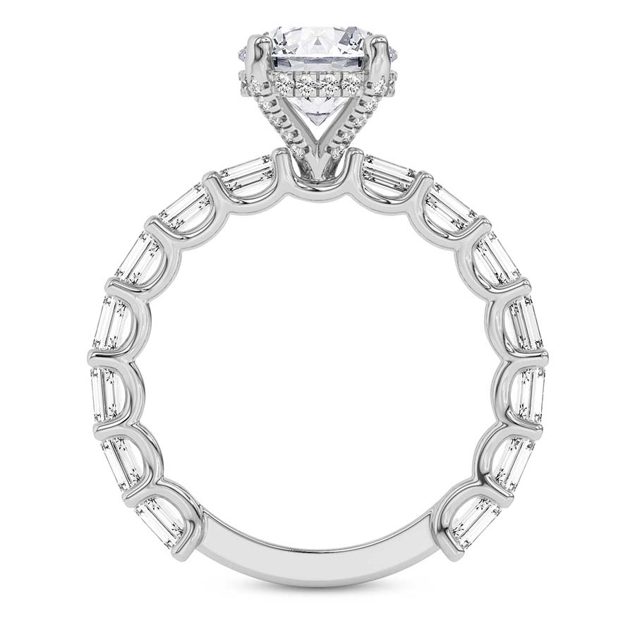 The Giselle Side Emerald Lab Diamond Ring in 21kt white gold is a true masterpiece, with a stunning center diamond set in a classic 4-round prong setting. Micro-set diamonds on the prongs add an intricate, sparkling detail, while hidden diamonds, visible from the side view, elevate the design with a touch of surprise. The shank is adorned with a 75% eternity spread of diamonds, each set in elegant “U” prongs, enhancing the ring’s graceful flow. This engagement ring seamlessly blends timeless elegance with contemporary brilliance, making it a perfect symbol of everlasting love. Pair it with a matching band to complete the look, creating a cohesive and radiant set that will shine for a lifetime.