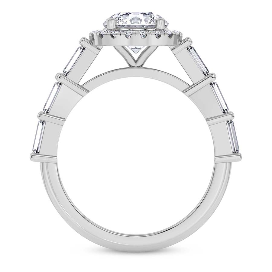 The Rachel Halo Side Stone Lab Diamond Ring combines classic beauty with modern style in 21kt white gold. The centre stone held in a secure four-prong setting. A radiant halo surrounds the stone, enhancing its brilliance. The smooth shank has baguette side stones in bar settings. These stones extend into a delicate bridge, adding to its beauty. With a 50% diamond spread, the straight dome shank and seamlessly integrated prongs create a flawless, elegant look. A stunning combination of luxury and conscious craftsmanship, this ring is perfect for those who appreciate sophistication with a mindful touch.
