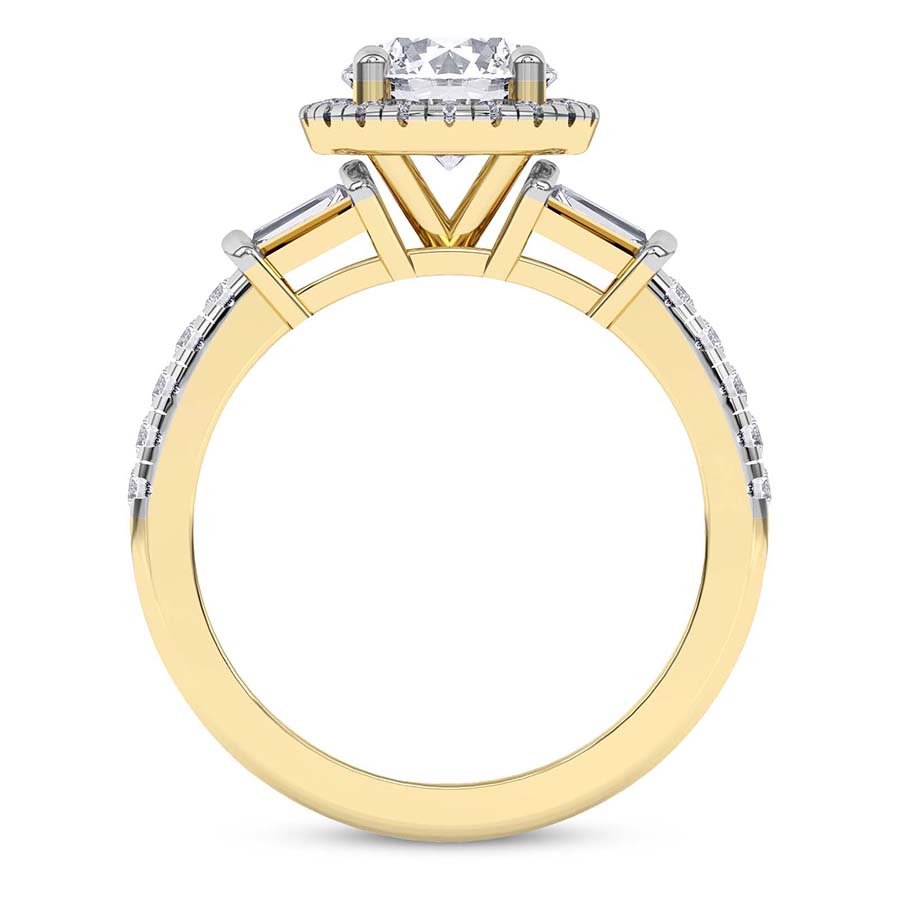 The Liora Cascade Halo Lab Diamond Ring in 14kt yellow gold exudes timeless elegance, featuring a center stone secured in a classic four-prong setting, surrounded by a dazzling diamond halo. Two tapered baguettes, totaling 0.60 carat, are set in sleek bar settings, further elevating the ring’s brilliance. The shank is adorned with prong set diamonds, creating a seamless 50% diamond spread. The straight, flat band and visible gallery enhance the sophisticated design, offering beauty from every angle. This stunning piece is a perfect choice for those who seek elegance and grace in every detail.